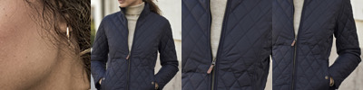 310T nylon outer. Polyester padding and lining.Showerproof.Shaped fit.Corduroy lined collar.Full length covered brass zip.Inner pocket.Two front pockets with brass stud closure.Elbow patches.Rear vents with brass stud closure.Branded zip pull and brass studs.Bound cuffs with stud closure.Bound open hem.Access for decoration.