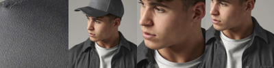 100% cotton twill; Moisture wicking swearband; Hood and loop closure; Embossed leather patch transitioning to woven patch, inventory may be mixed;