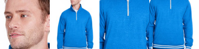 6.5 oz., 60% cotton 40% polyester single-dyed fleece; 1x1 rib yarn-dyed stripe inside collar, cuffs and waist; unconcealed brushed nickel ¼ zip placket ; self fabric side gussets with side welt pockets;