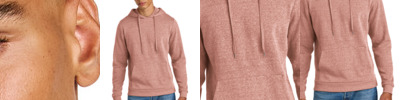 7.5 oz., 55% cotton, 39% polyester, 6% rayon triblend fleece; off white drawcords; 1x1 rib armhole openings and waistband; set-on pouch pocket;