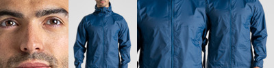 100% recycled polyester. AquaDry membrane. Showerproof. Grown on hood. Full length zip with chin guard and inner zip guard. Two front zip handwarmer pockets. Tear release adjustable cuffs. Packs away into stuff sack.