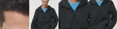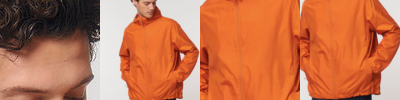 Longer back length with curved hem for protection. Bottom hem and hood with adjustable plastic stopper and elastic cord. Sealed hood visor. Zipped welt pockets. Non-functional flap, front and back. Self-fabric half-moon at back neck. Inside zip opening at bottom hem and inside loop, with snap at armhole providing easy access for chest decoration.
