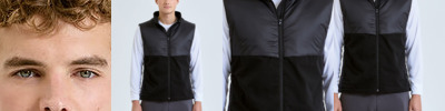 Hybrid gilet with padded panel upper chest and side seams. Lower jacket is shell fabric. Full zip-through style with collar. Drawcord inner hem. Zip side pockets. Concealed packable hood with adjustable cord and toggle to the back for to create a snug fit. Zip embroidery access to back panel and left chest. Inner pocket to left chest. Internal storm flap with zip guard. Packable bag included for handy storage of gilet when not in use. We recommend using block out vinyl and inks.