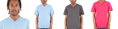 6.2 oz., 100% USA cotton, 18 singles; Heather Grey is 90% USA cotton/10% polyester; Shoulder-to-shoulder neck tape; 1" double-needle stitched sleeve and bottom hems; 7/8" Seamless non-topstitched v-neck collar; Heat transfer label; Quarter-turned to eliminate center crease; Forward-thrusted shoulder seam for comfortable neck fit;