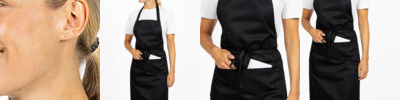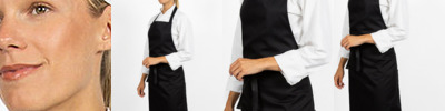 65% polyester/35% cotton. Self fabric neckband with adjustable buckle.Large front pocket.Reinforced straps and pocket.Self fabric ties.Width 71cm.Length 91cm.Domestic wash 40°C.