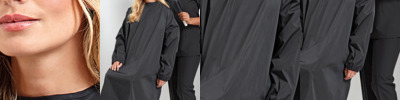 100% polyester with polyurethane coating. Waterproof and bleach resistant fabric. Adjustable tear release closure on back neck. Hanging loop. Elasticated cuffs. Length 108cm. Industrial laundry 85°C. Domestic wash 60°C.