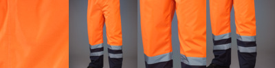 100% waterproof 300D polyester with oxford PU coating. Conforms to EN ISO 20471: 2013 + A1: 2016 class 1 and EN343.RIS-3279-TOM (orange only).Waterproof with taped seams.Elasticated waistband.Two side pockets.Two reflective bands around lower legs.Contrast lower legs.Open leg ends with stud adjusters.