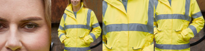 300D polyester outer. Mesh lining.Conforms to EN ISO 20471: 2013 + A1: 2016 class 3, EN343: class 3:3.Waterproof with taped seams.Windproof and breathable.Concealed hood.Heavy duty two way zip with tear release storm flap.Two reflective bands around the body, sleeves and one over each shoulder.Part elasticated waist.Two angled front pockets with tear release flaps and reflective piping.Inner pocket.Tear release adjustable cuffs.Access for decoration.
