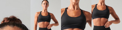 Women's core bra with medium impact. Round neckline with cross over elastic strap back. Bra clasp fastening. Permanent cups, non removeable. Tear-out label.