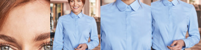 57% polyester/39% cotton/4% elastane. Easy care stretch fabric.Semi-fitted.Rounded collar.Concealed placket.Princess seams.Back yoke.Single button cuffs.Curved hem.