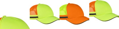 100% polyester front panel; Mesh back panels; 5-panel; Reflective sandwich bill; Reflective taping on mesh panels and closure; Two-piece hook and loop closure;