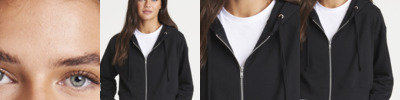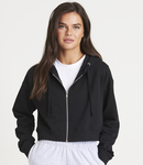 80% ringspun cotton/20% polyester.* Soft cotton faced fabric. Brushed back fleece. Drop shoulder style. Ladies relaxed fit. Double fabric hood with flat lace drawcord. Full length metal YKK zip. Cropped length. Ribbed cuffs and hem. Twin needle stitching. Tear out label.