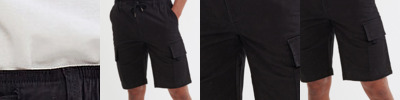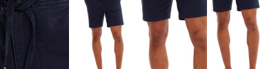 Two swing pockets and two back jet pockets with button fastening to one. Coin pocket. Elasticated waistband with drawstrings. Gunmetal eyelets and caps to drawstrings. Zip fly and button fastening to the front. Soft finish fabric. Shorts can be worn rolled up.