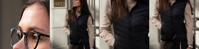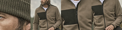 Rubber zip puller at side pockets. Chest pocket with hidden zipper. Bonded fleece in the inside.