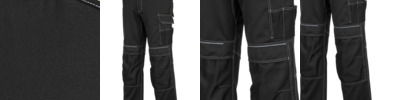 65% polyester/33% cotton/2% elastane kingsmill fabric. UPF rating 50+.Two way stretch fabric.Part elasticated waistband with high rise back.Belt loops.Zip fly with button over.D-ring.Two holster pockets.Two side pockets.Two rear pockets, right with tear release flap.Left leg multi-use pocket.Hammer loop.Double ruler pocket.Top loading knee pad pockets - knee pads included.Adjustable leg length reg 31" to tall 33".Reinforced panels in high wear areas.Triple stitched seams.Contrast stitching.