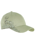 100% brushed cotton twill; Structured front; Pre-curved visor; Hook and Loop backstrap; Detailed embroidered wildlife scene on right side; Dri Duck embossed leather patch left of back vent;