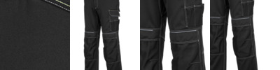 65% polyester/33% cotton/2% elastane kingsmill fabric. Two way stretch fabric. Part elasticated waistband with high rise back. Belt loops. Zip fly with button over. D-ring. Two side pockets. Two rear pockets, right with tear release flap. Left leg multi-use pocket. Hammer loop. Double ruler pocket. Top loading knee pad pockets. Adjustable leg length reg 31" to tall 33". Reinforced panels in high wear areas. Triple stitched seams. Contrast stitching. Knee pads available PW102.
