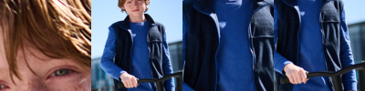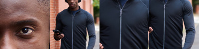 95% recycled polyester/5% elastane. Drop shoulder style with forward facing seams. Full length zip with chin guard and inner zip guard. Open cuffs and hem. Contrast cover stitching.