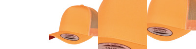 Trucker cap in bright neon colors, polyester mesh, adjustable, and color-matching snapback closure, straight, six-way quilted visor.
