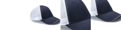 Two-toned mesh cap with color-matching snapback closure, one size fits all, made of cotton and polyester, 8-fold quilted, pre-bent visor, breathable material.