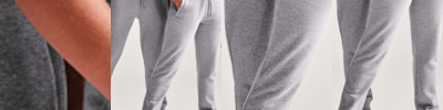 80% organic cotton/20% recycled polyester.* Soft cotton faced fabric.Brushed back fleece.Ribbed waistband with drawcord.Nickel free eyelets and drawcord tips.Two side zip pockets.2x1 ribbed cuffed leg ends.Twin needle stitching.Unbranded size label at neckline.