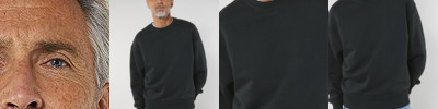 Set-in style, round neck, neck rib, double seams at the hem and sleeve openings, necktape.