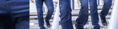 Woven stretch fabric with a DWR (Durable water-repellent) finish. Ripstop stretch fabric to knee, seat panels and re-enforcement at the hem. Part elasticated waist and high back waistband. Multi pocketed with front and rear zipped pockets.