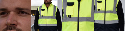 100% recycled polyester (some colours in transition). Pinstripe detail.Conforms to EN ISO 20471: 2013 + A1: 2016 class 2, EN 14116 and EN 1149.Tear release front closure.Two reflective bands around the body and one over each shoulder.