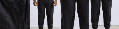 87% cotton/12% polyester/1% elastane. Elasticated waistband with drawcord.Belt loops.Mock fly.Two side pockets - right with coin pocket.Rear patch pockets.Cuffed ankles.Domestic wash 40°C.