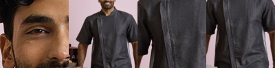 60% cotton/40% polyester twill. White 65% polyester/35% cotton twill.Denim 60% cotton/40% polyester twill.Mandarin collar stand.Tab on back neck to hold apron in place.Concealed zip closure.Left sleeve double pen pocket.Side vents.Denim colours have reverse colour underarm panels and down the sides.White has an underarm breathable mesh panel.Domestic wash 60°C.