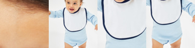 100% organic combed ringspun cotton. Organic or in-conversion to organic cotton.Single layer fabric.Popper closure on back neck.Bound edges.Tear out label.