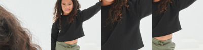 Black 80% cotton/20% polyester.Heather grey 70% cotton/30% polyester.Brushed back fleece.Drop shoulder style.Oversized fit.2x2 ribbed collar and cuffs.Taped neck.Cropped length.Raw edge hem.Tear out label.