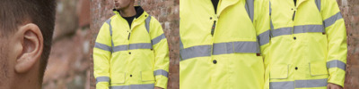 PU coated polyester. Polyester lining.Conforms to EN ISO 20471: 2013 + A1: 2016 class 2, EN343: class 3:1.Black ribbed knit collar.Full length zip.Reversible.Outside has two reflective bands around the body and one over each shoulder.Two front pockets with flaps on hi-vis side.Two front pockets on navy reverse.Branding on lower right pocket flap.