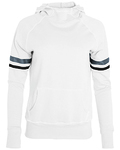 9 oz., 50% cotton/50% polyester smooth athletic fleece; Woven label; No drawcord on girls sizes; Contrast color three-needle coverstich; Raglan sleeves with contrast color sleeve stripes and thumbholes for warmth; Front pouch pocket; Rib-knit cuffs and bottom band;