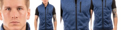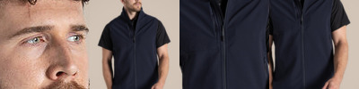 Water-resistant and windproof softshell vest with 3 pockets. Recycled polyester elastane softshell with EcoShield DWR finish. Striped microfleece back and recycled zip tapes.