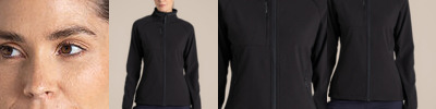 Water-resistant and windproof softshell jacket with 3 pockets. Recycled polyester elastane softshell with EcoShield DWR finish. Striped microfleece back and recycled zip tapes.