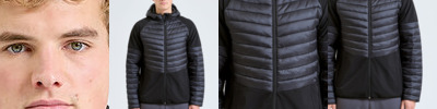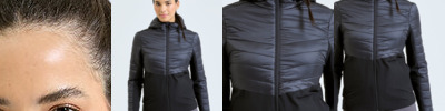Hybrid jacket with diagonal quilted upper chest and back. Lower jacket is shell fabric. Full zip-through style with panelled hood. Hood is elasticated for a snug fit. Front pockets. Quilted detailing to arms with lower arm in shell fabric. Internal storm flap with zip guard. We recommend using block out vinyl and inks.Product contains no branded neck or waist label. Removable Kimble or looped garment tags. Inner seam label holds important product information on one label with a second label containing brand information which can be cut-away.