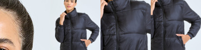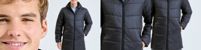 Lightweight mid-length padded jacket with diagonal quilting to centre front and back for a flattering fit. Vertical quilting side panels to body and horizontal quilting to arms. Full zip-through style with hood. Panel detailing to hood with elasticated finish for a snug fit. Internal storm flap. Zipped side pockets. Two concealed inner pockets, one left chest for storing items like a mobile phone or keys. Elasticated cuffs. Packable bag included for handy storage of jacket when not in use. We recommend using block out vinyl and inks.Product contains no branded neck or waist label. Removable Kimble or looped garment tags. Inner seam label holds important product information on one label with a second label containing brand information which can be cut-away.