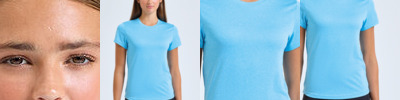 Wicking fabric. Stretch. Crew neck. Short sleeve. Lightweight. Twin-needle stitching on hem and arms. Recycled polyester. We recommend using block out vinyl and inks.Product contains no branded neck or waist label. Removable Kimble or looped garment tags. Inner seam label holds important product information on one label with a second label containing brand information which can be cut-away. UPF 40+.