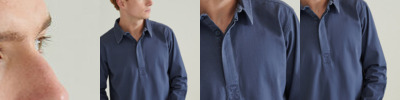 Long-sleeved plain drill shirt. Pullover with concealed button fastenings. Heavy garment wash. Adjustable button cuff and placket. Shaped hem. Back neck hanging loop. Back neck buggy. Self-fabric vent inserts. Tag-free for easy rebranding.