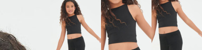 Kids cropped top with racer shape on front and back on neckline. Twin-needle stitching on hem, armholes and neckline. Cropped length. Tear-out label.