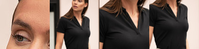 Lightweight 90% polyester/10% spandex knit * Wicks moisture * Ladies' fit * Tag-free label * V-neck collar * Modified raglan to prevent shoulder seams from showing under shell