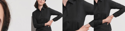 True easy care fabric requires minimal ironing. Darts at bustline and back panel for tailored fit. 2 button collar stand with classic shaped collar. Rounded 2 button adjustable cuffs.