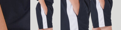 Kids’ shorts with elasticated waist and inner drawcords. Zipped side seam pockets. Twin-needle stitched hem.