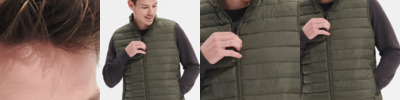 Polyester outer and lining. Polyester down padding. Showerproof. Lightweight. Collar high full length nylon zip. Elasticated bound armholes and hem. Two front zip pockets. Packs into unbranded storage bag. Unbranded size label.