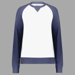 * 7.6 ounce 55% polyester/41% cotton/4% rayon, super soft fleece * Ladies' fit * Woven label * Exterior faux leather logo loop label * Contrast color V insert at center front neck * Raglan sleeves * Rib-knit collar, cuffs and bottom band