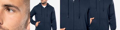 80% cotton/20% polyester. Soft cotton faced fabric.Brushed back fleece.Drop shoulder style.Honeycomb lined hood with chunky flat lace drawcord.Taped neck.Full length zip.Front pouch pockets.Ribbed cuffs, hem and pocket edges.