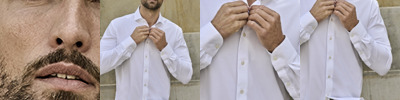 91% cotton/9% elastane. Single jersey knit.Easy care fabric.Four-way stretch.Moisture wicking and quick drying.Pre-shrunk.Shaped fit.Wide spread collar.Pearlised buttons.Back darts.Two button adjustable cuffs with button on cuff gauntlet.Modern shaped cuffs.Curved hem.