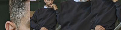 80% ringspun cotton/20% polyester. Interlock knit.Unbrushed.Ribbed collar, cuffs and hem with elastane.Herringbone taped neck.Stitched V detail at front neck.