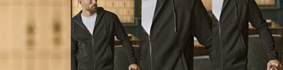 80% ringspun cotton/20% polyester. Interlock knit.Unbrushed.Drop shoulder style.Double fabric hood with self colour drawcord.Herringbone taped neck.Full length SBS zip.Two front pockets.Ribbed cuffs and hem with elastane.